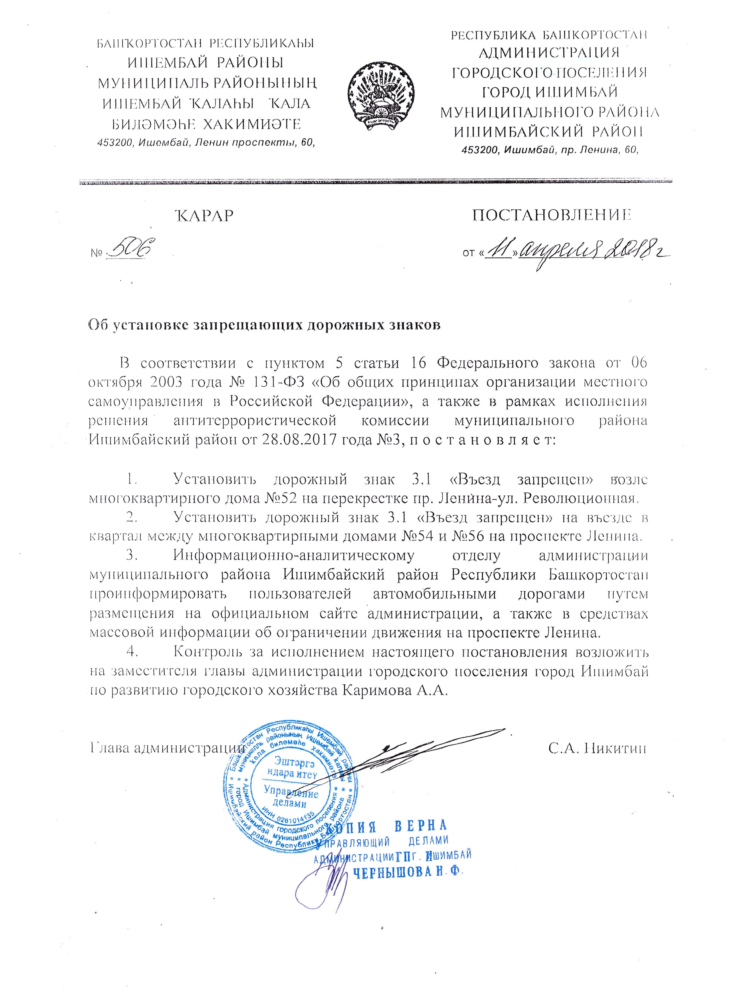 В соответствии с пунктом 5 статьи 16 Федерального закона от 06 октября 2003 года № 131-ФЗ "Об общих принципах оррганизации местного самоуправления в Российской Федерации", а также в рамках исполнеиня решения антитеррористической комиссии муниципального района Ишимбайский район от 28.08.2017 года №3 вышло постановление об установке дорожного знака 3.1 "Въезд запрещен" возле многоквартирного дома №52 на перекрестке пр. Ленина-ул. Революционная, а также на въезде в квартал между многоквартирными домами №54 и №56 на проспекте Ленина.