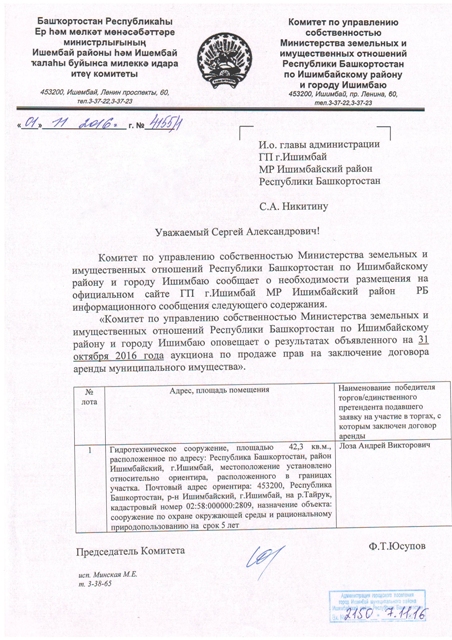 Комитет по управлению собственностью Министерства земельных и имущественных отношений Республики Башкортостан по Ишимбайскому району и городу Ишимбаю оповещает о результатах объявленного на 31 октября 2016 года аукциона по продаже прав на заключение договора аренды муниципального имущества.