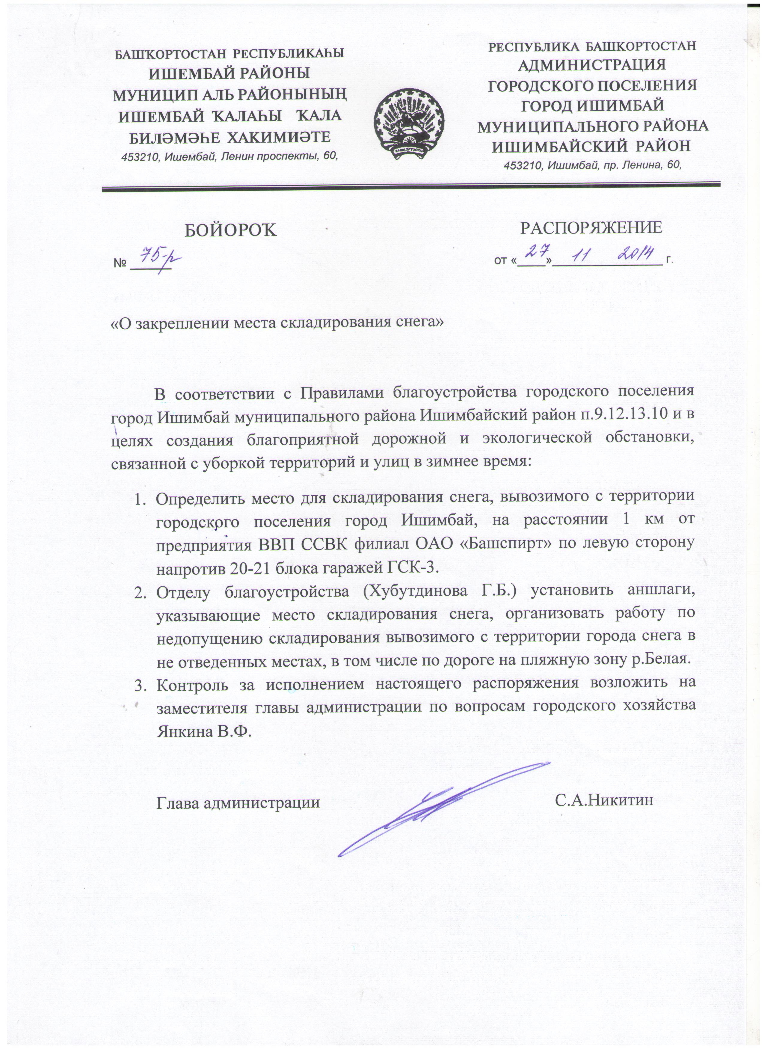 В целях организации мест санкционированного складирования снега в зимний период, согласно распоряжению главы администрации городского поселения г.Ишимбай от 21 ноября 2014 года № 75-р, определено место на расстоянии 1 км от предприятия ВВП ССВК филиал ОАО «Башспирт» по левую сторону напротив 20-21 блока гаражей ГСК-3.