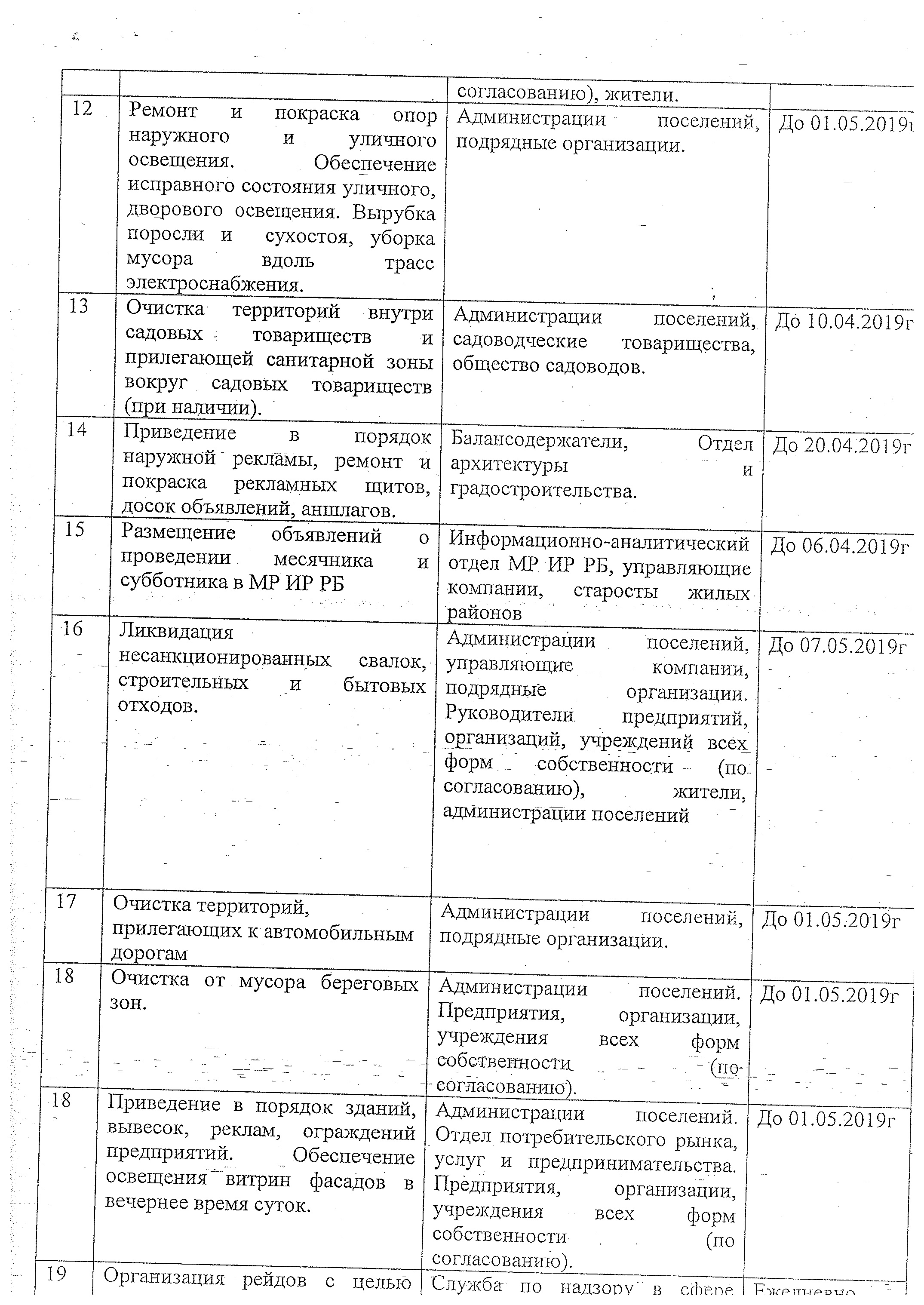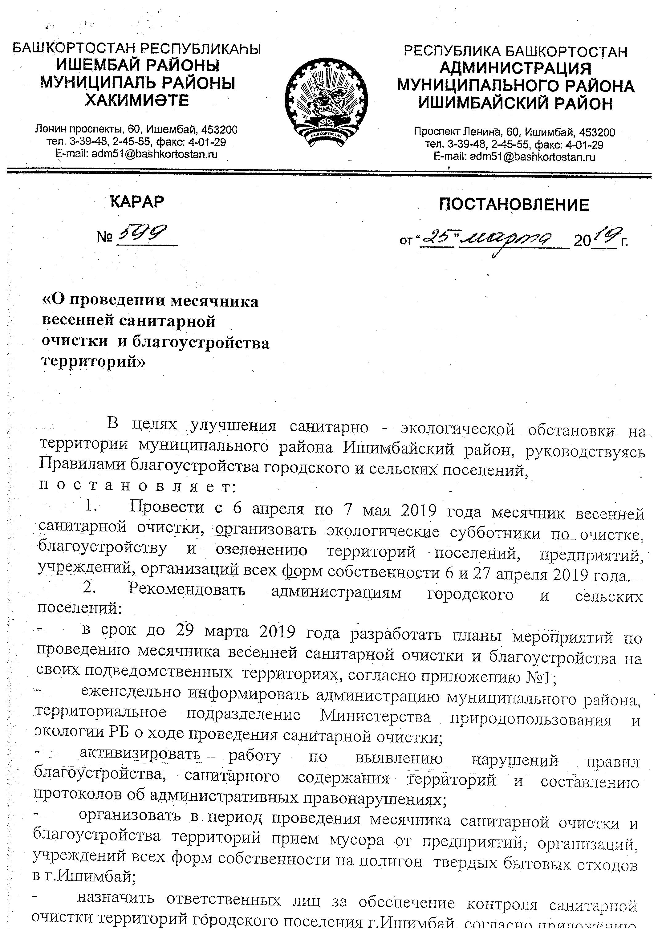 С начала следующего месяца в целях улучшения санитарно-экологической обстановки на территории муниципального района Ишимбайский район начинается месячник весенней санитарной очистки. Будут организованы экологические субботники по очистке, благоустройству и озеленению территорий поселений, предприятий, учреждений, организаций всех форм собственности 6 и 27 апреля 2019 года.