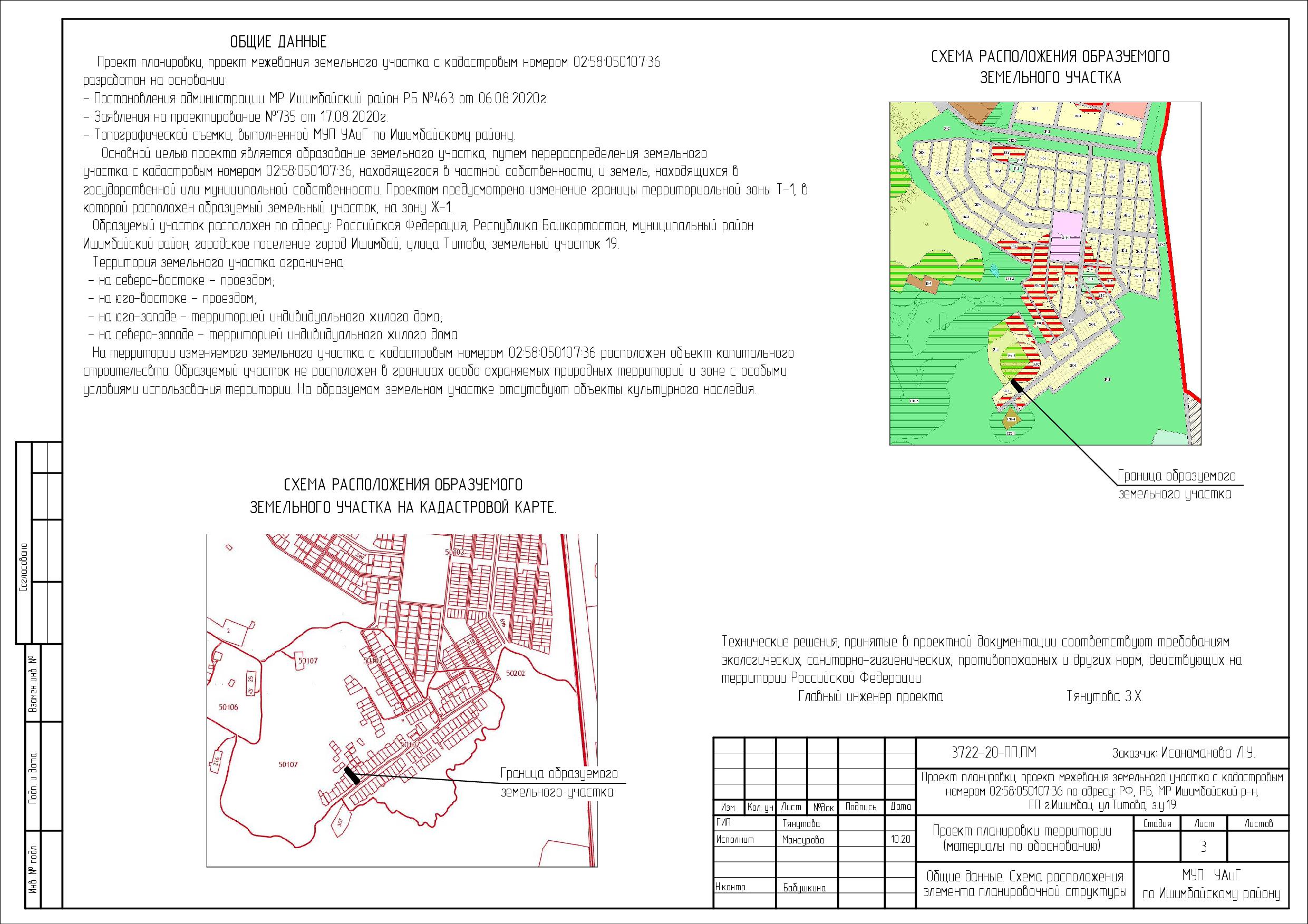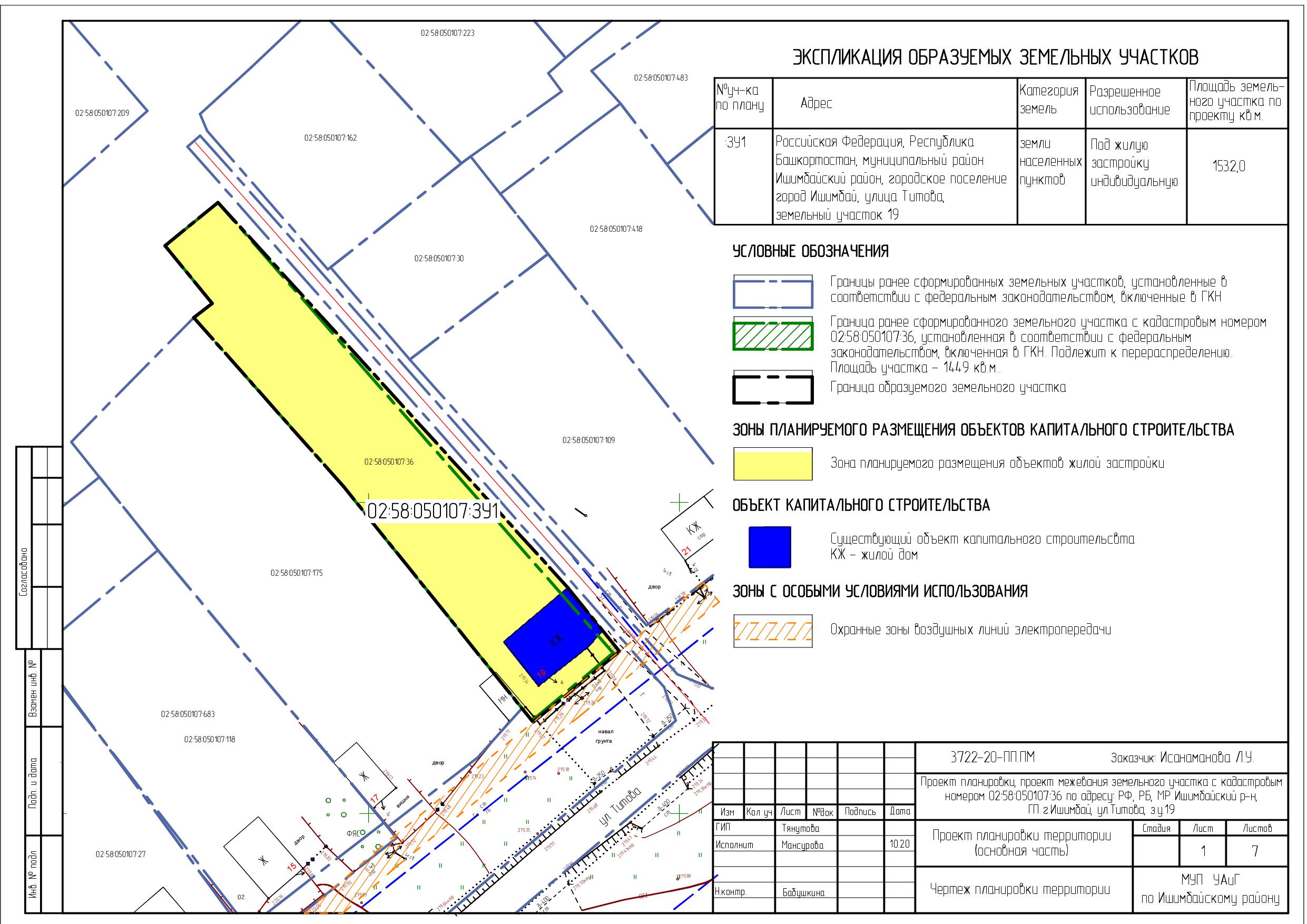 - «Проект планировки, проект межевания земельного участка с кадастровым номером 02:58:050107:36 по адресу: Российская Федерация, Республика Башкортостан, муниципальный район Ишимбайский район, городское поселение город Ишимбай, улица Титова, земельный участок 19» (проектом предусмотрено перераспределение земельного участка с целью увлечения территории для обслуживания индивидуального жилого дома).